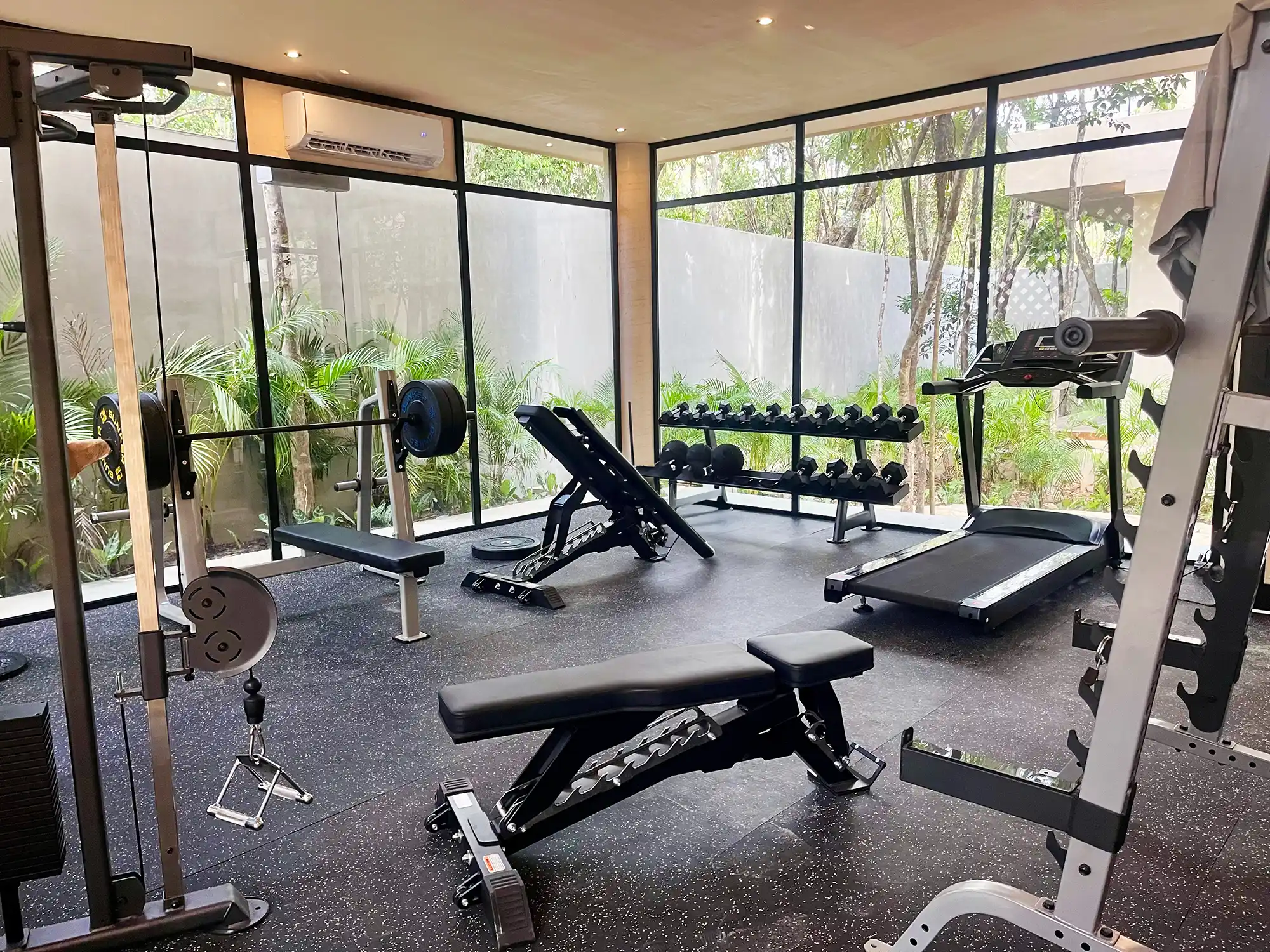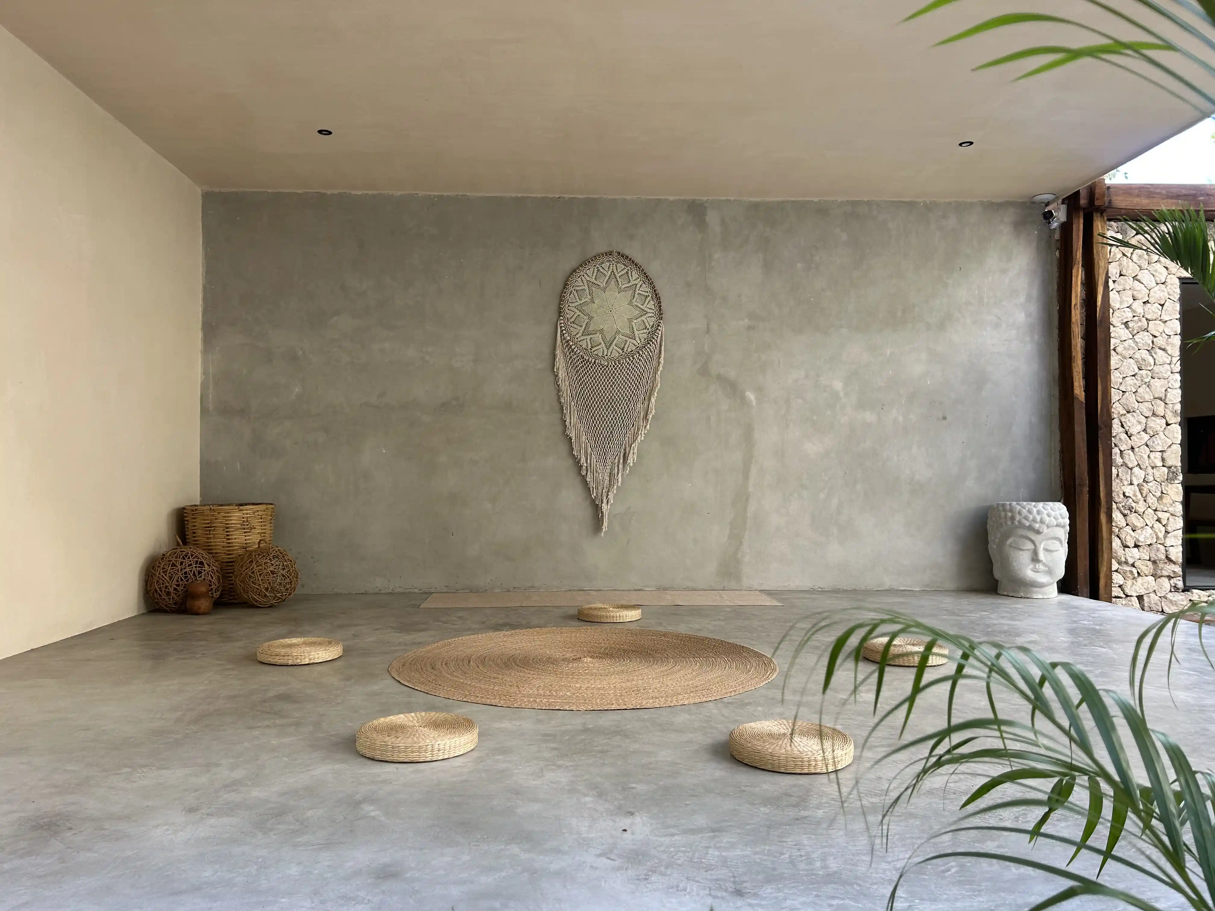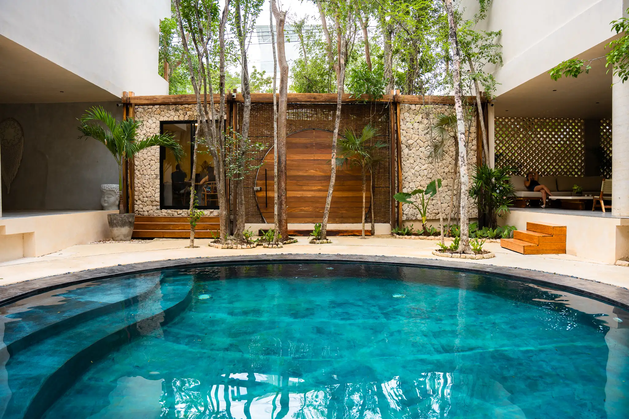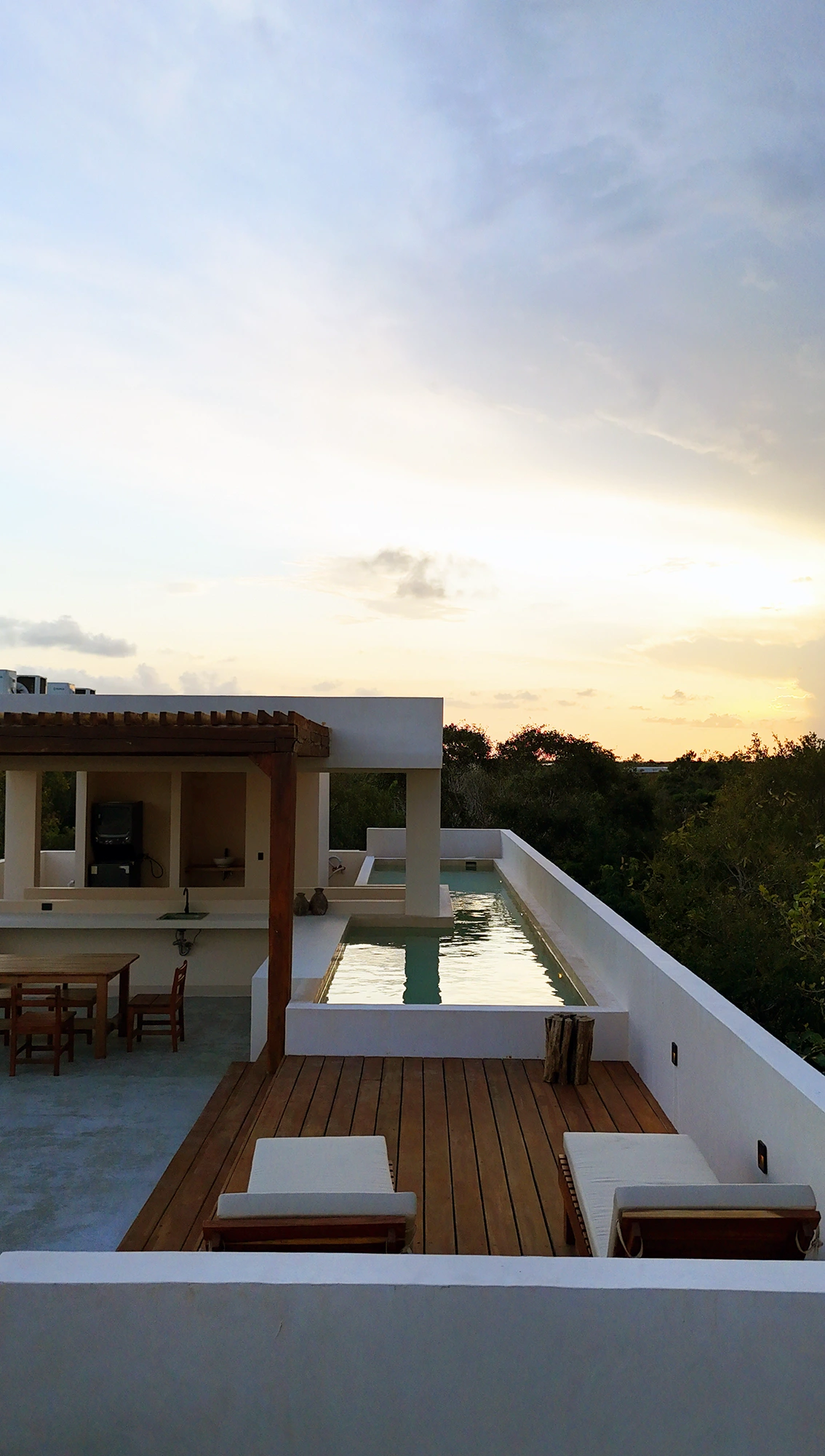 Fully equipped studios featuring a kitchen, bathroom, closet, jungle-view balcony, A/C, and signature Tulum-style decor. Includes access to a shared rooftop with laundry room, grill, solarium, designer pool, and bar.