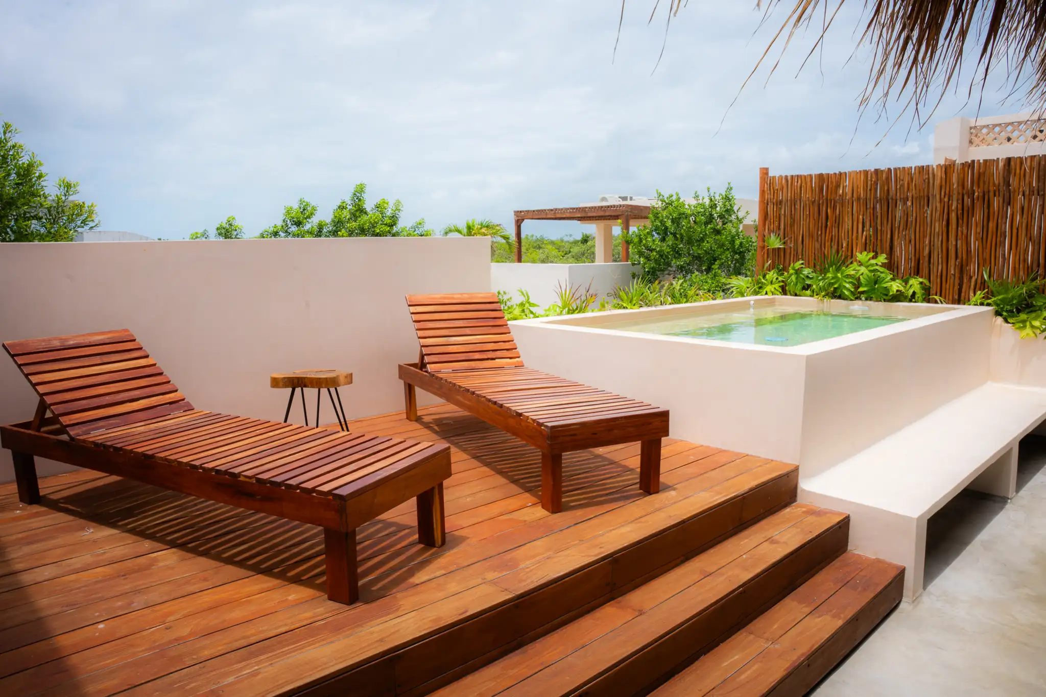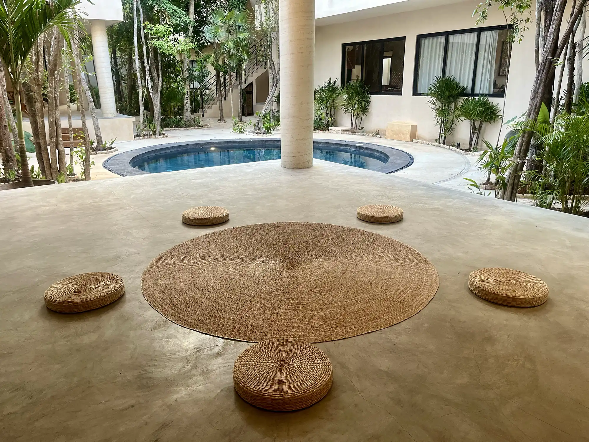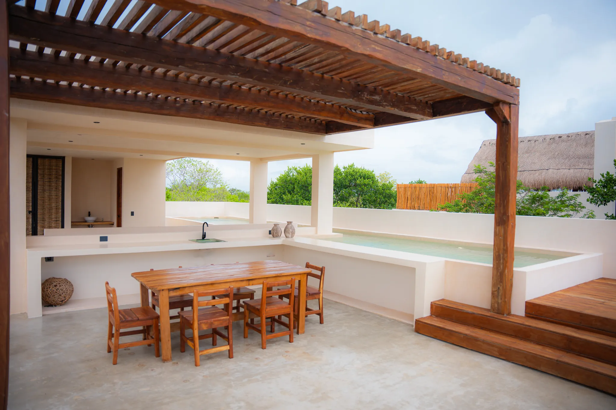 One-bedroom suite with a full bathroom, closet, and a balcony overlooking the main pool. Includes a fully equipped kitchen, A/C, and Tulum-inspired decor.