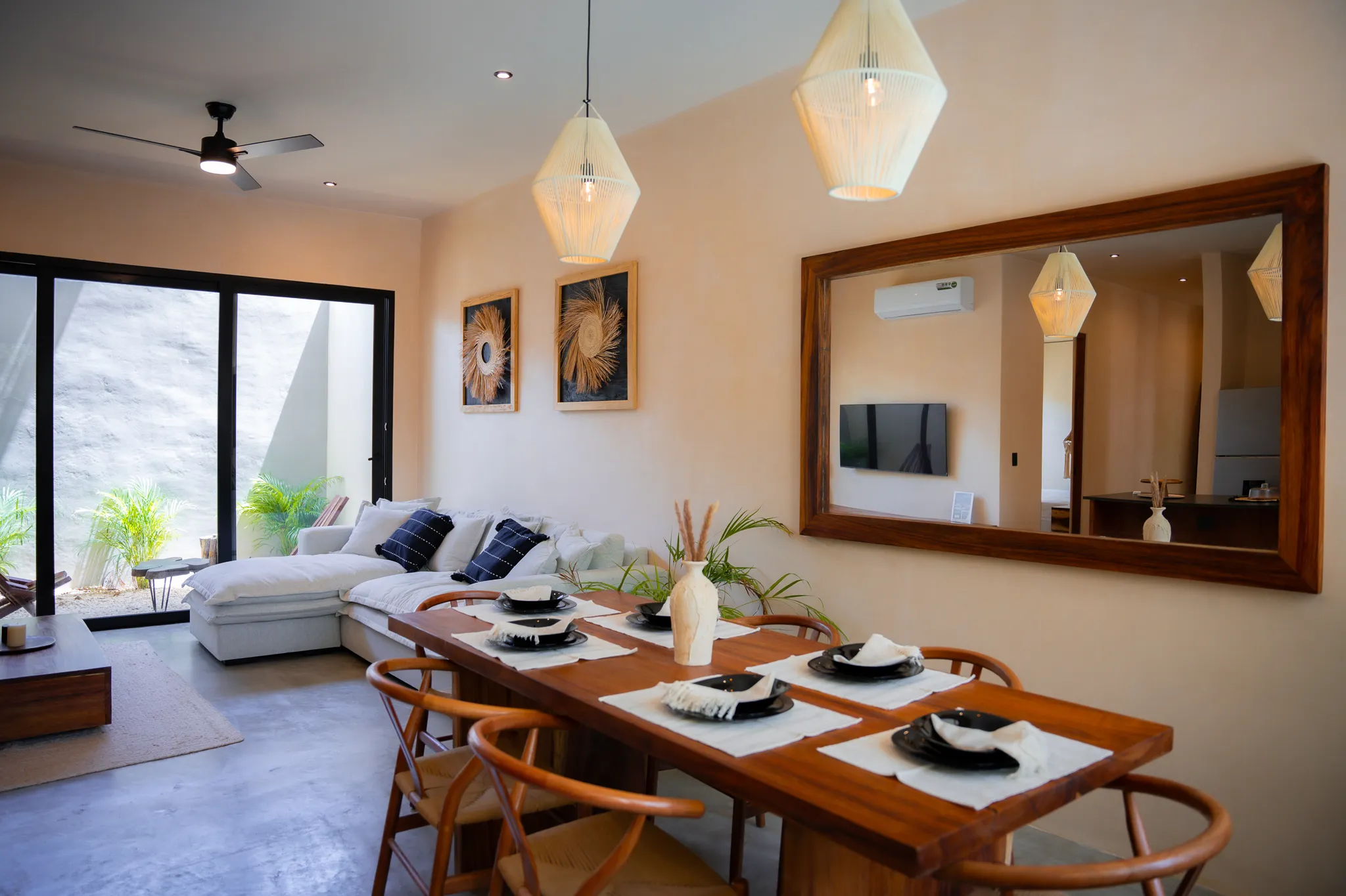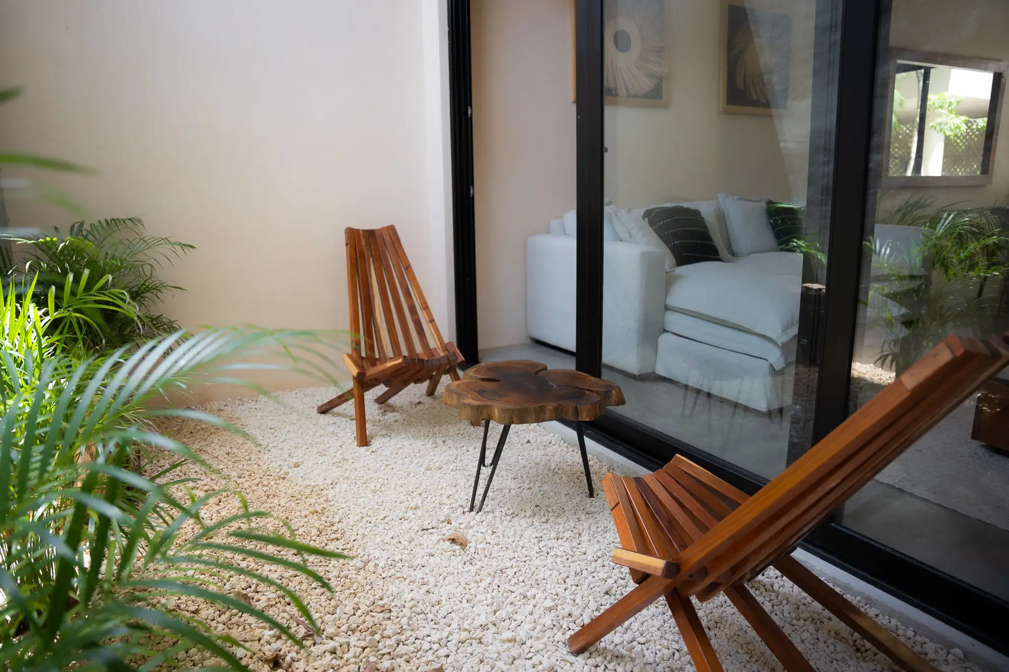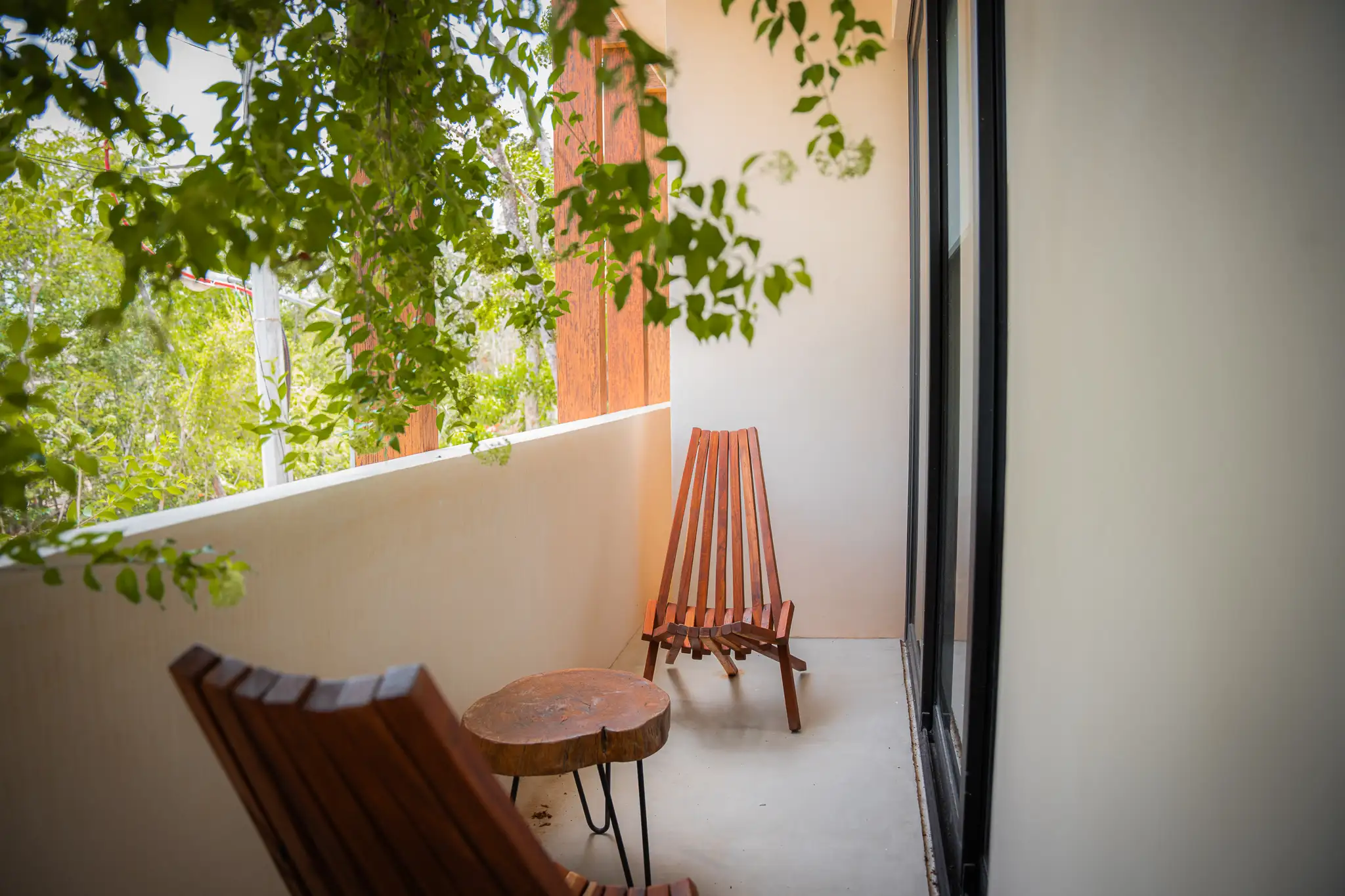 One-bedroom suite with a full bathroom, closet, and a balcony overlooking the main pool. Includes a fully equipped kitchen, A/C, and Tulum-inspired decor.