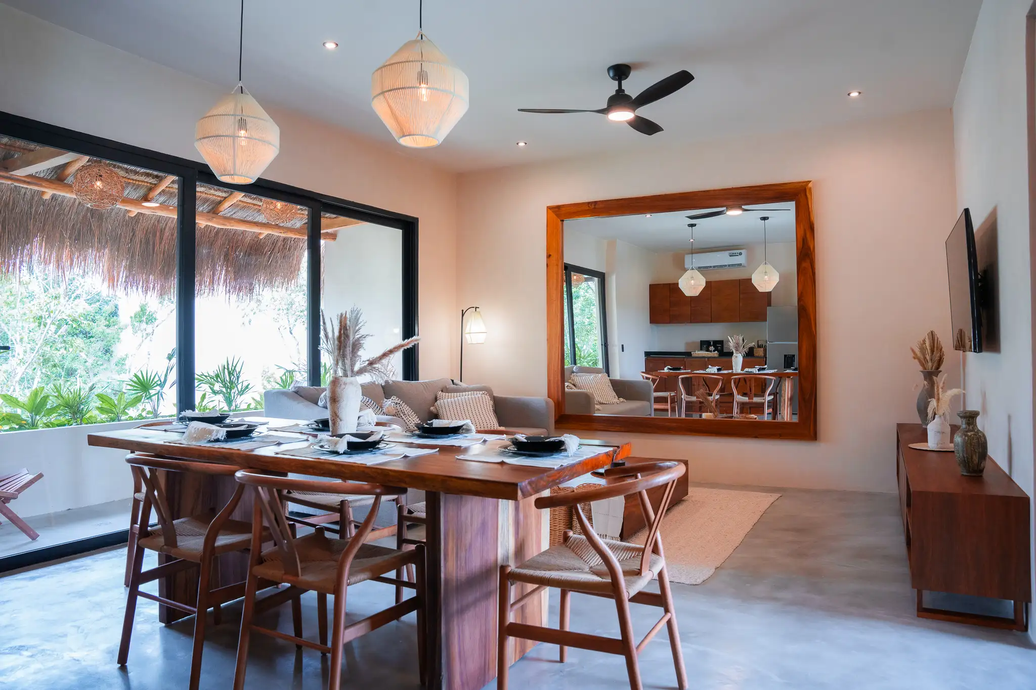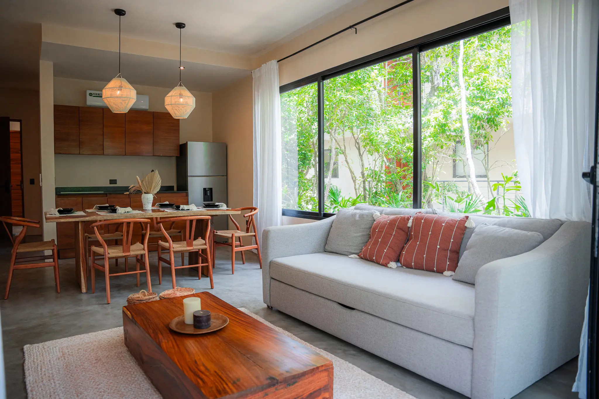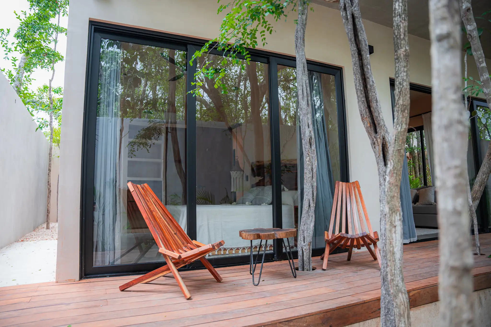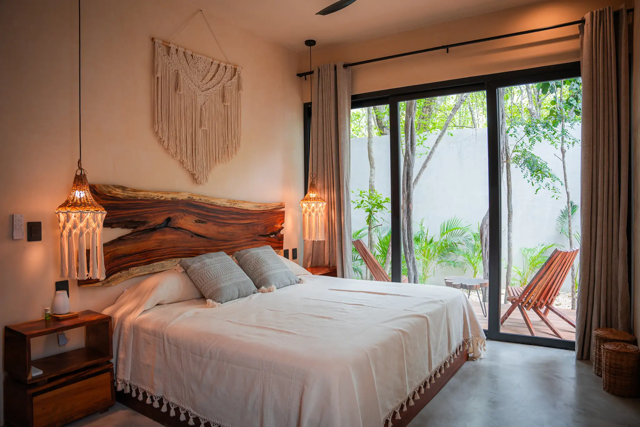 Two-bedroom suite with two full bathrooms, closets, and a terrace or balcony overlooking the jungle. Includes a fully equipped kitchen, A/C, and Tulum-style decor.