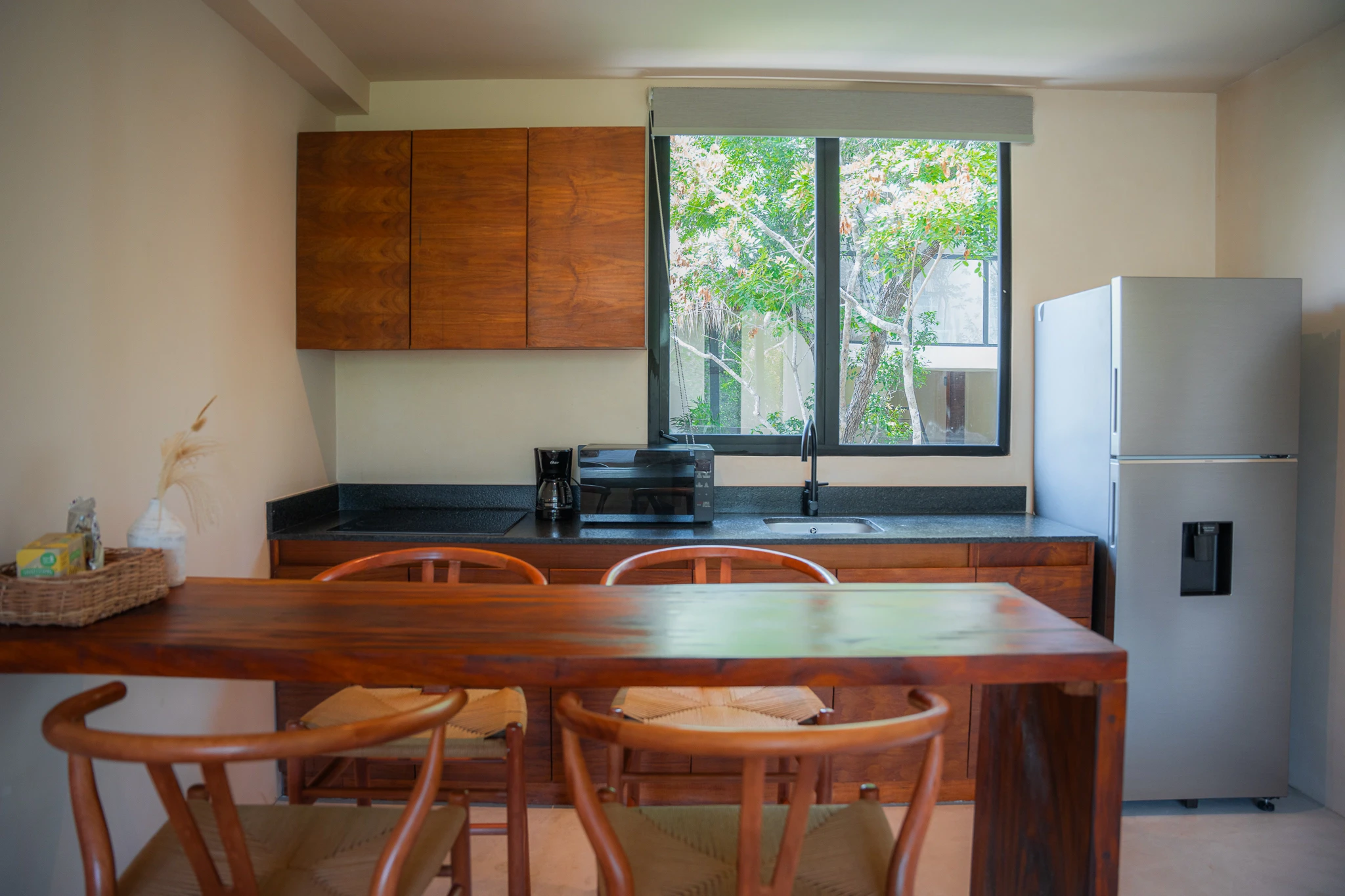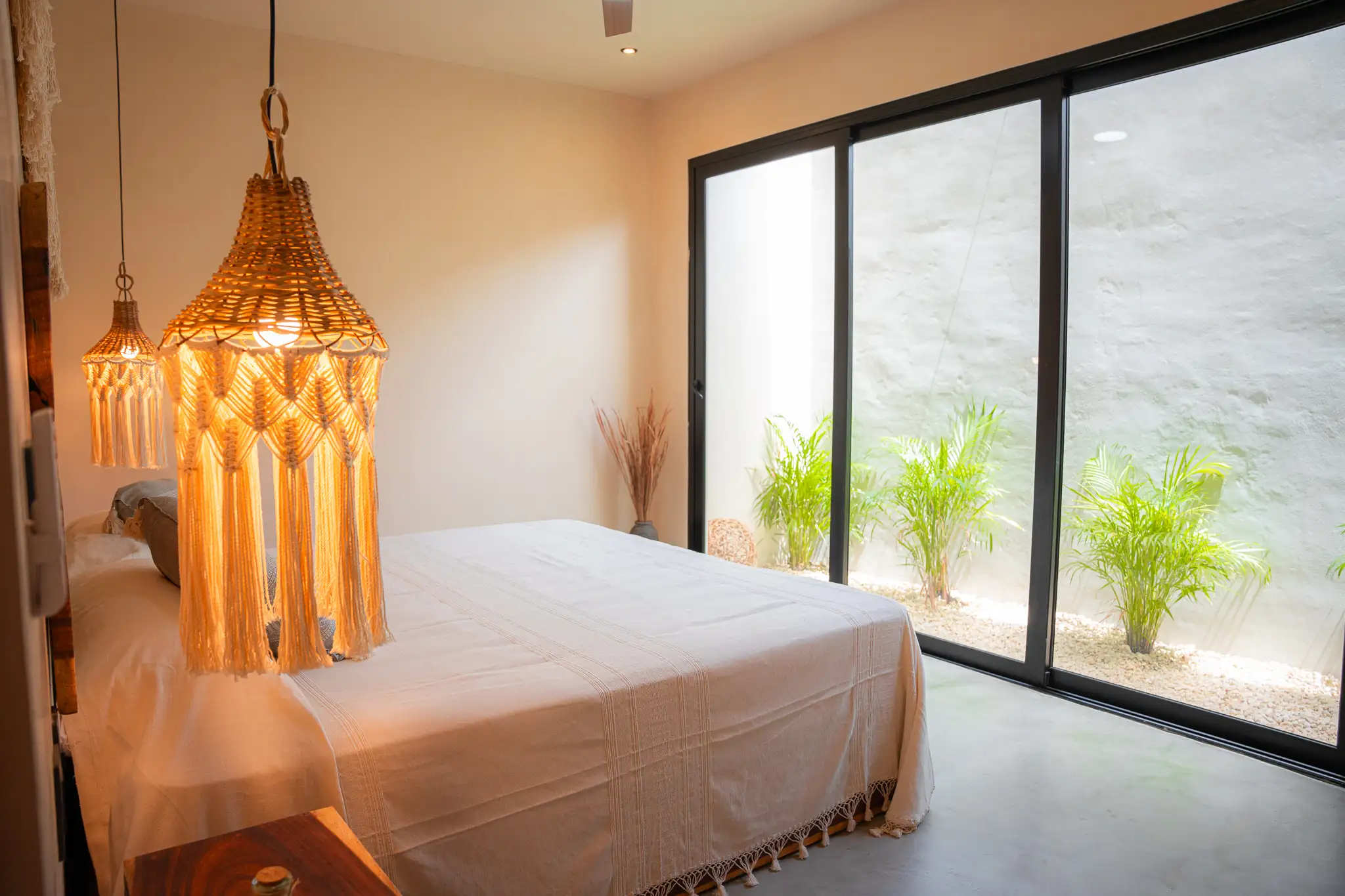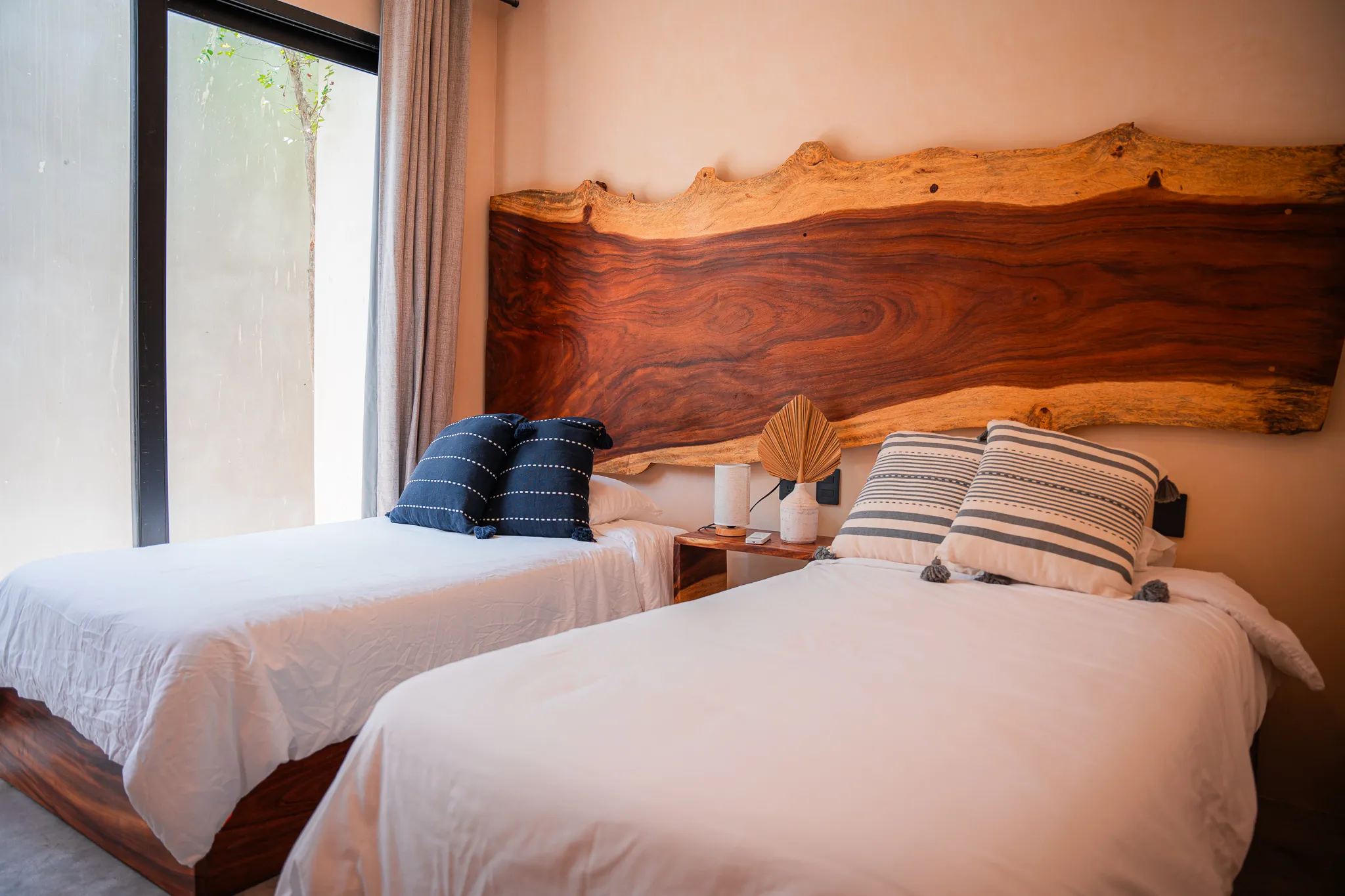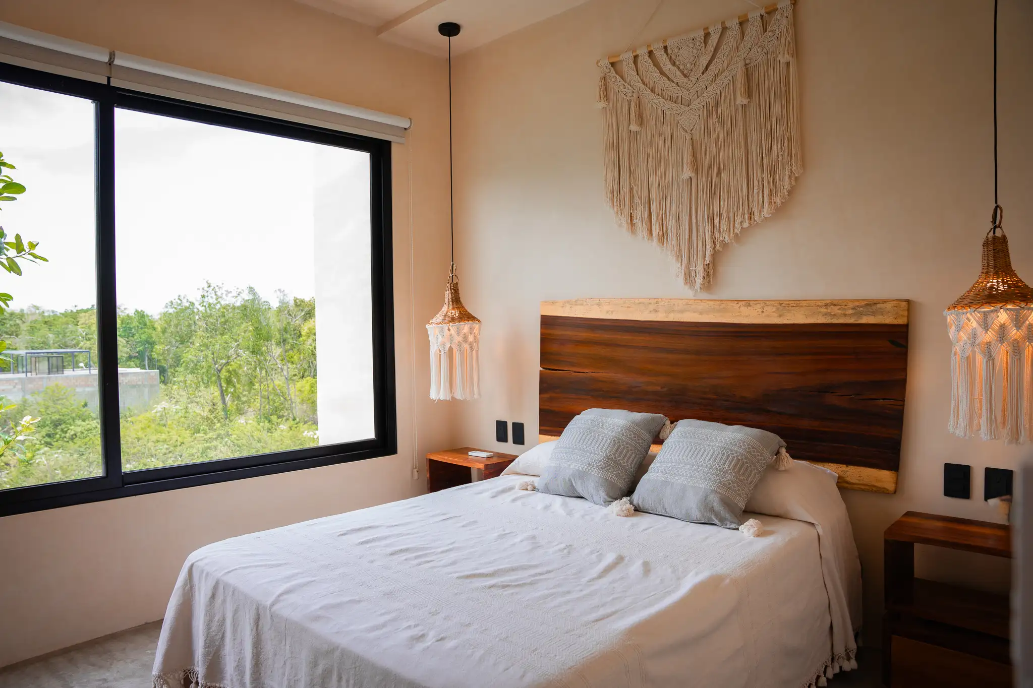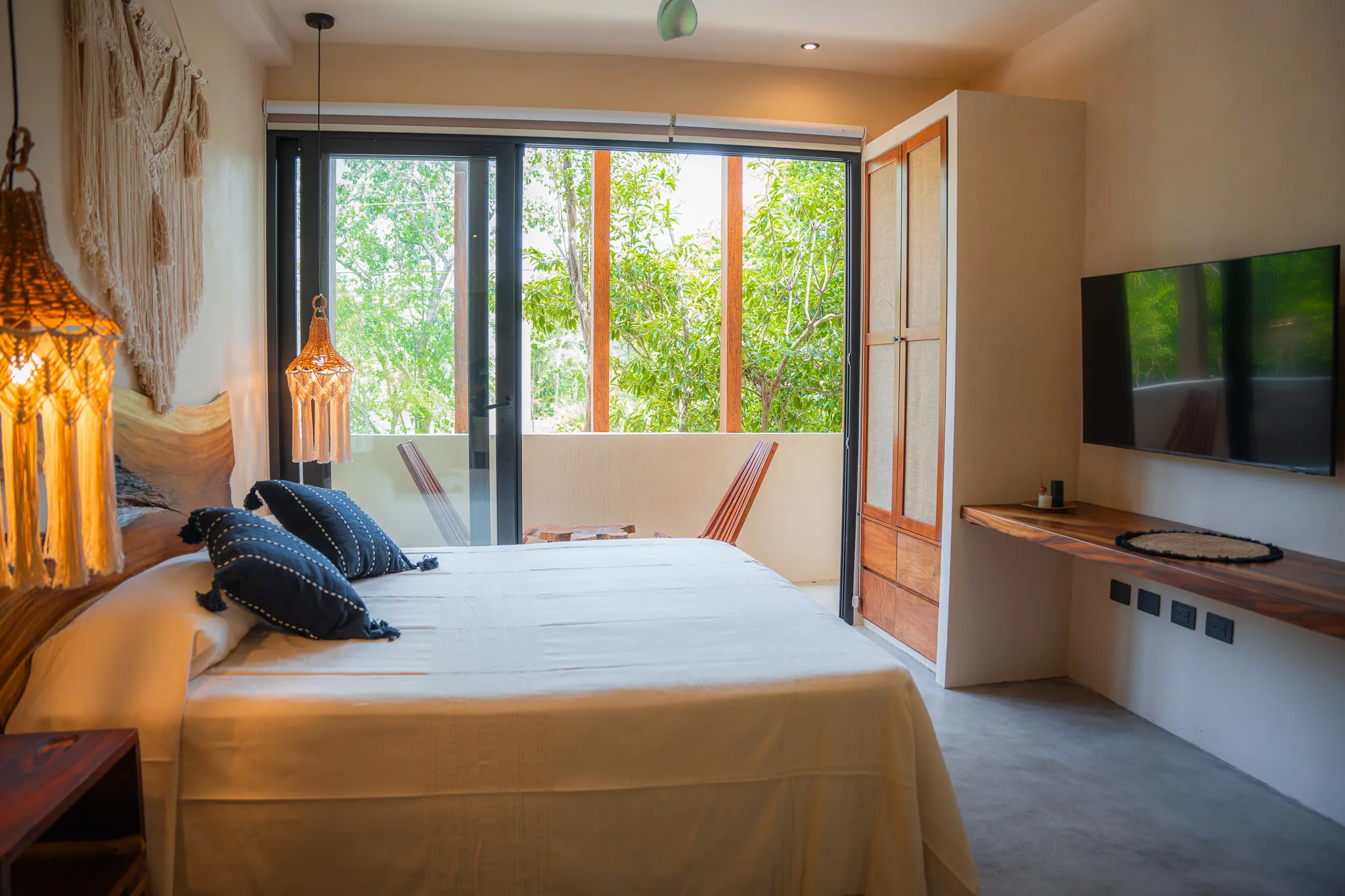 One-bedroom suite featuring a full bathroom, closet, and balcony overlooking the main pool. Includes a fully equipped kitchen, A/C, and Tulum-inspired decor.